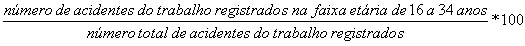 A avaliação da ocorrência de acidentes do trabalho pode ser aprimorada com a elaboração de indicadores por grupos etários. Este indicador tem por objetivo revelar o risco específico de se acidentar para o subgrupo populacional de trabalhadores na faixa etária de 16 a 34 anos e pode ser expresso como a proporção de acidentes que ocorreram nesta faixa etária em relação ao total de acidentes.