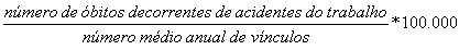 O coeficiente é calculado pelo número de óbitos decorrentes dos acidentes do trabalho e o número total de acidentes, conforme descrito abaixo: