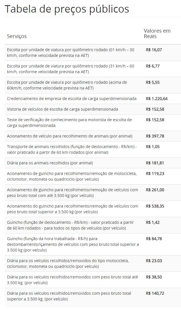 Os preços para retribuição dos serviços prestados pela Polícia Rodoviária Federal -PRF são os constantes da tabela anexa a esta Portaria.