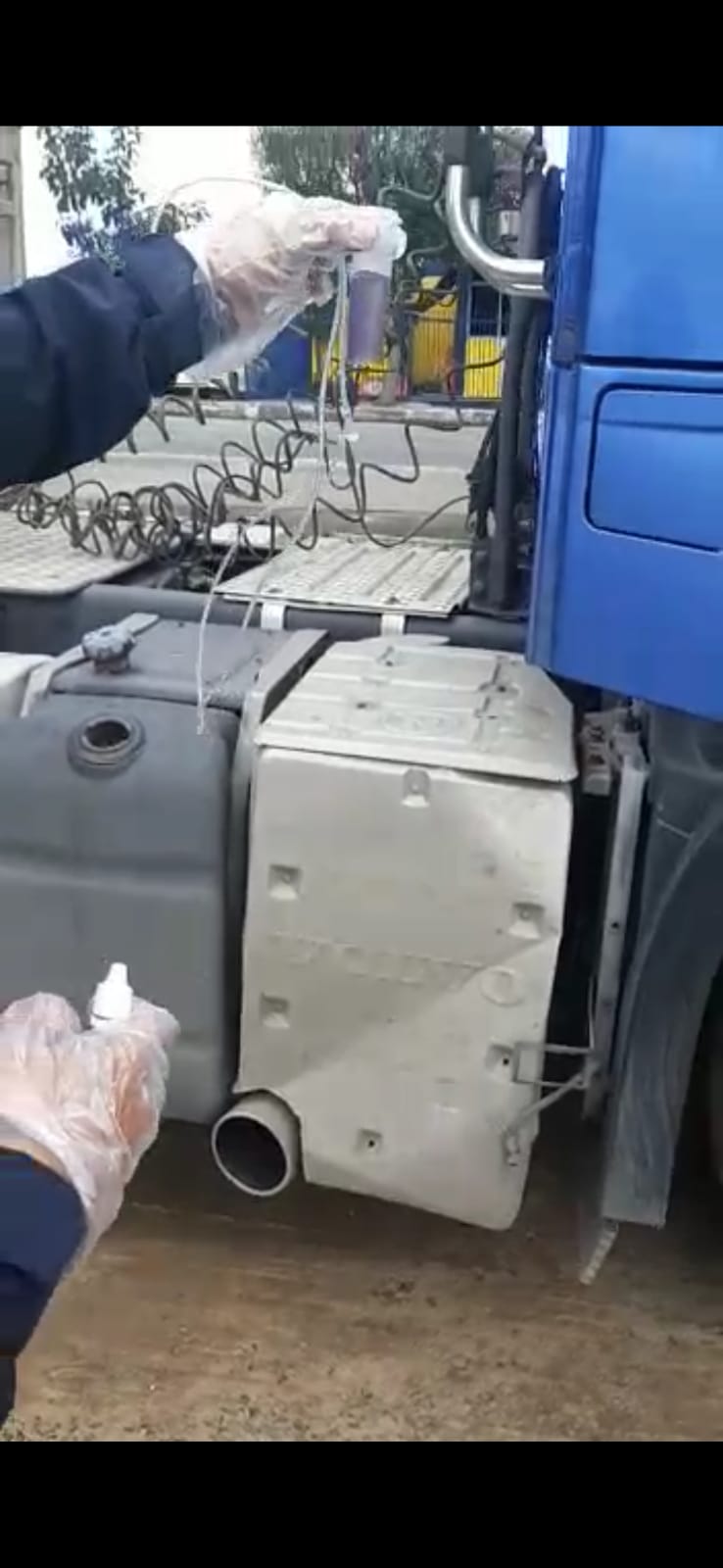 O líquido que estava no tanque do ARLA 32 do caminhão estava contaminado com presença de minerais, conforme reação após teste com reagente (resultado na cor violeta). Essa irregularidade no sistema de tratamento dos gases acaba gerando elementos poluidores e/ou degradadores ao meio ambiente.