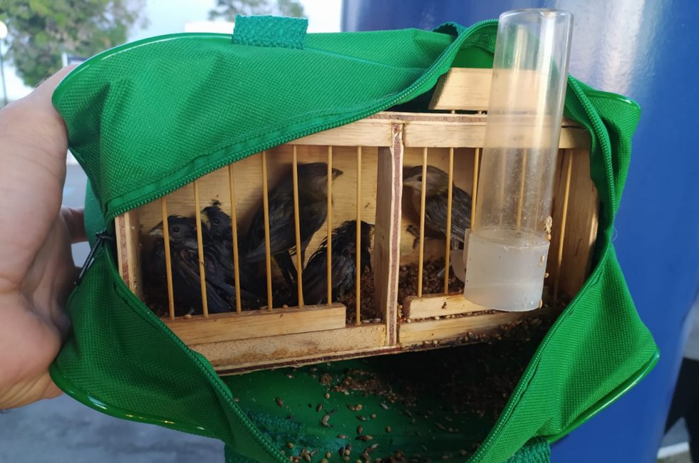 Durante a fiscalização de um ônibus interestadual, os policiais visualizaram uma pequena bolsa de cor verde com uma gaiola contendo cinco aves silvestres embaixo de uma das poltronas. Apesar dos esforços da equipe, não foi possível identificar o responsável pelos animais.