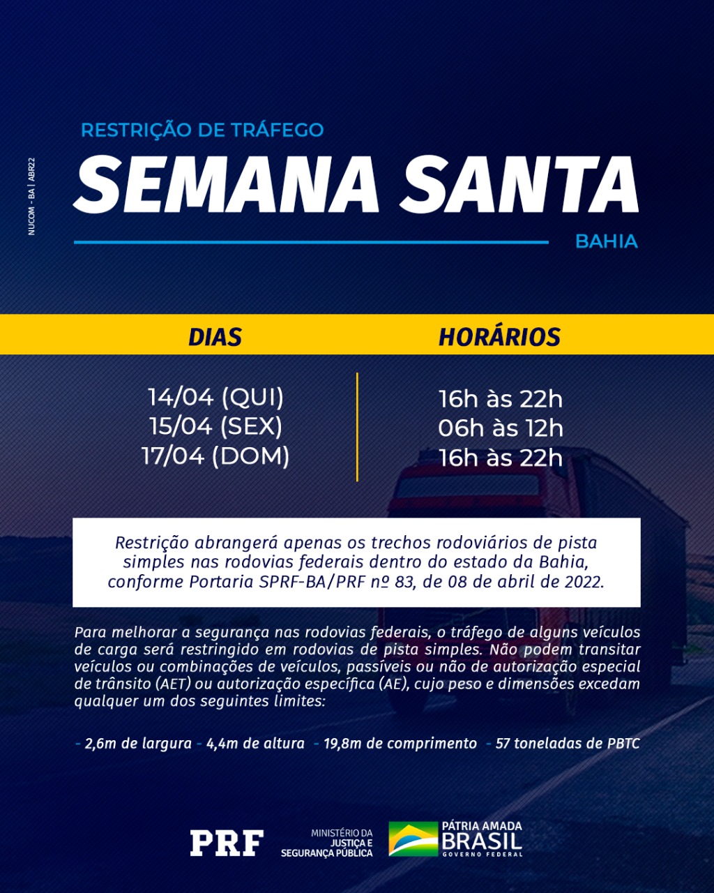 A restrição abrangerá apenas os trechos rodoviários de pista simples dentro do estado da Bahia, com exceção dos trechos específicos e o descumprimento constitui infração de trânsito de natureza média (5 pontos) e multa de R$ 130,16, sendo que o motorista só poderá voltar a circular após o término do horário da restrição.