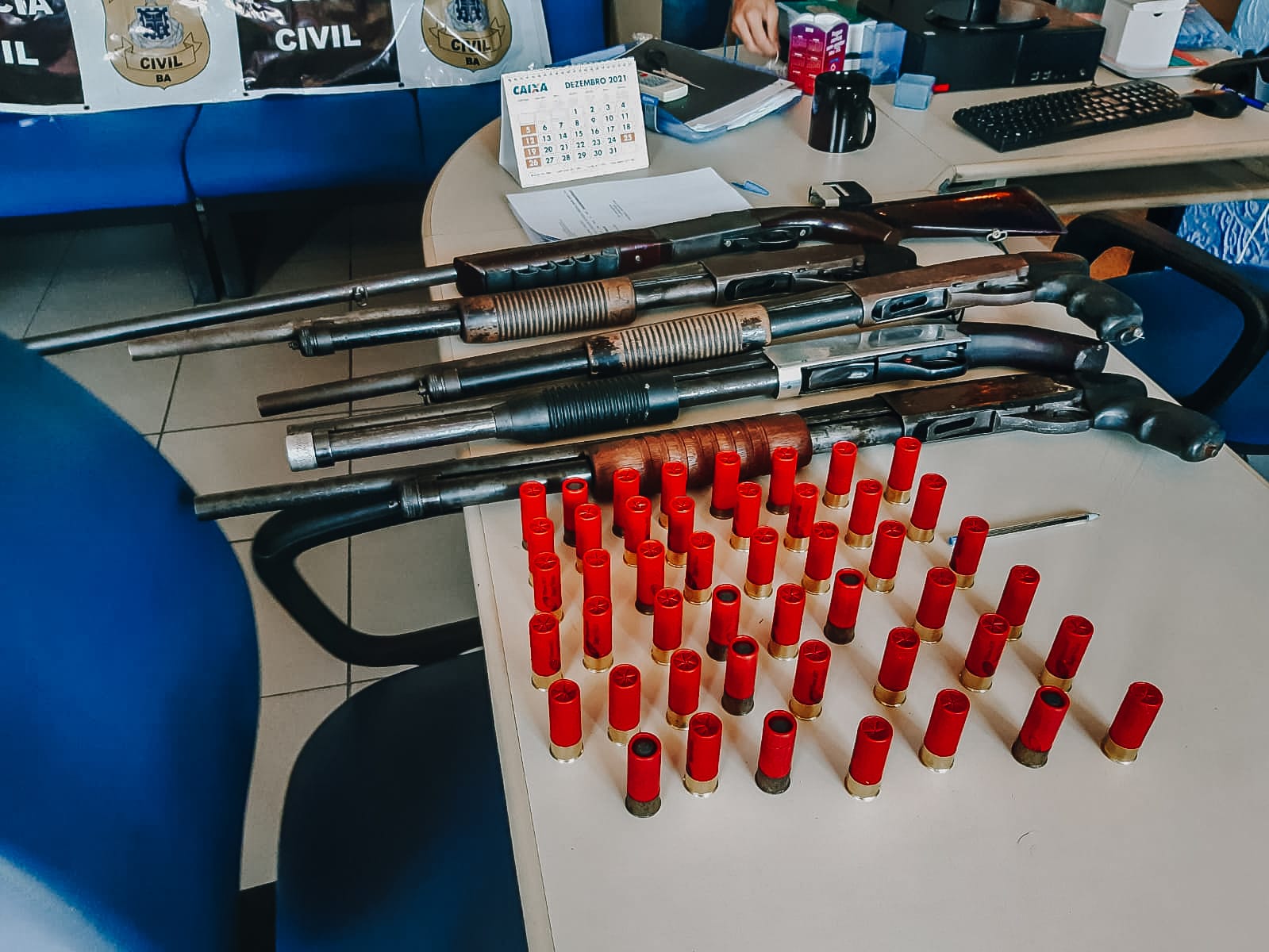 Em ação conjunta para coibir o tráfico de drogas e armas de fogo realizada no município de Ibirapitanga (BA), a Polícia Rodoviária Federal (PRF) e a Polícia Civil da Bahia, através da 7º Coordenadoria Regional de Polícia do Interior (COORPIN) apreenderam na madrugada de hoje (18), 05 espingardas cal. 12 e 47 munições.