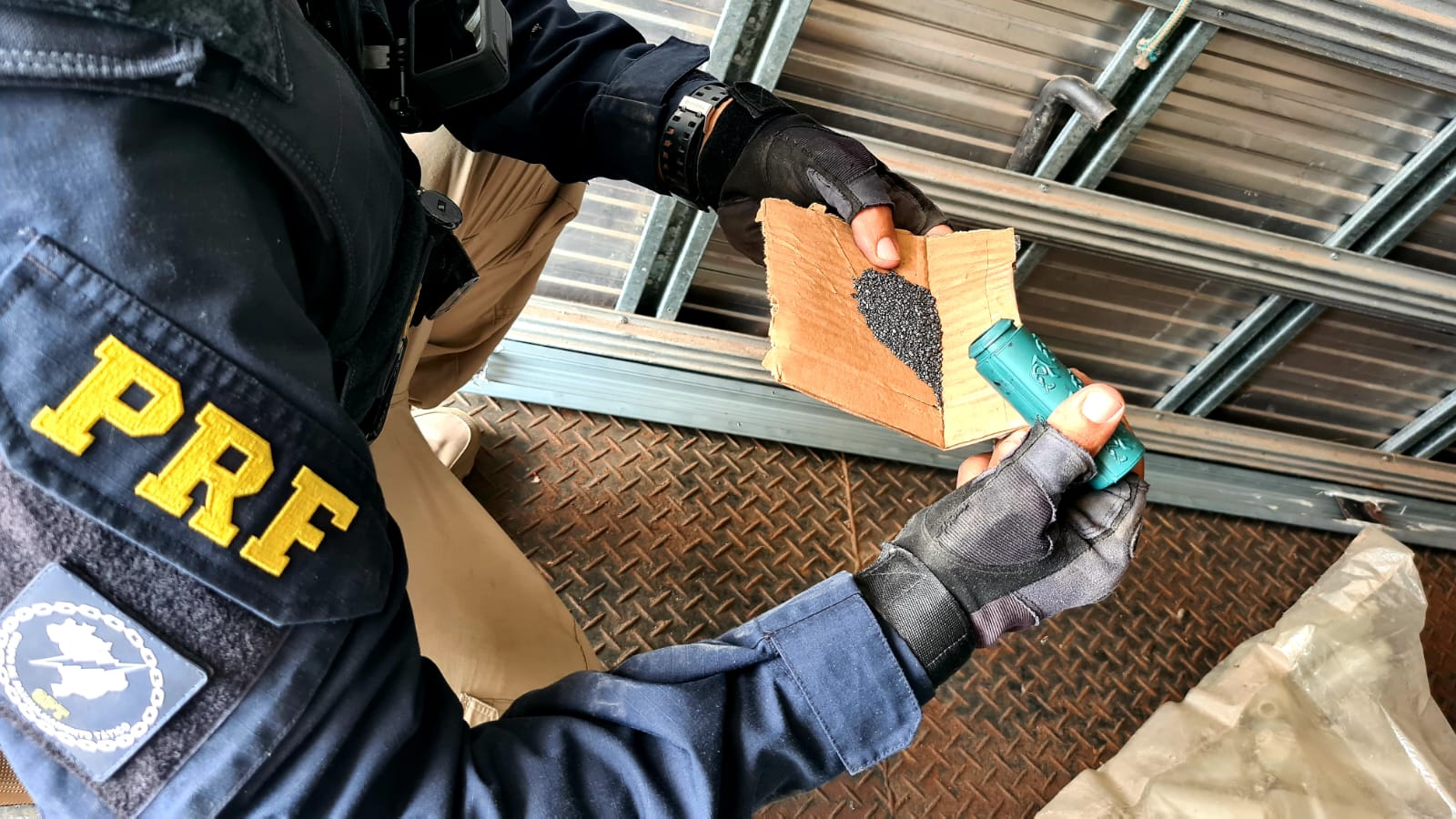 Em seguida a equipe conseguiu acesso ao fundo falso e ali foram encontradas 115 caixas, contendo 25 mil tubos de pólvora, material explosivo, com peso total aproximado de 1.304 Kg, desprovido de qualquer documentação que comprovasse a licitude do transporte.