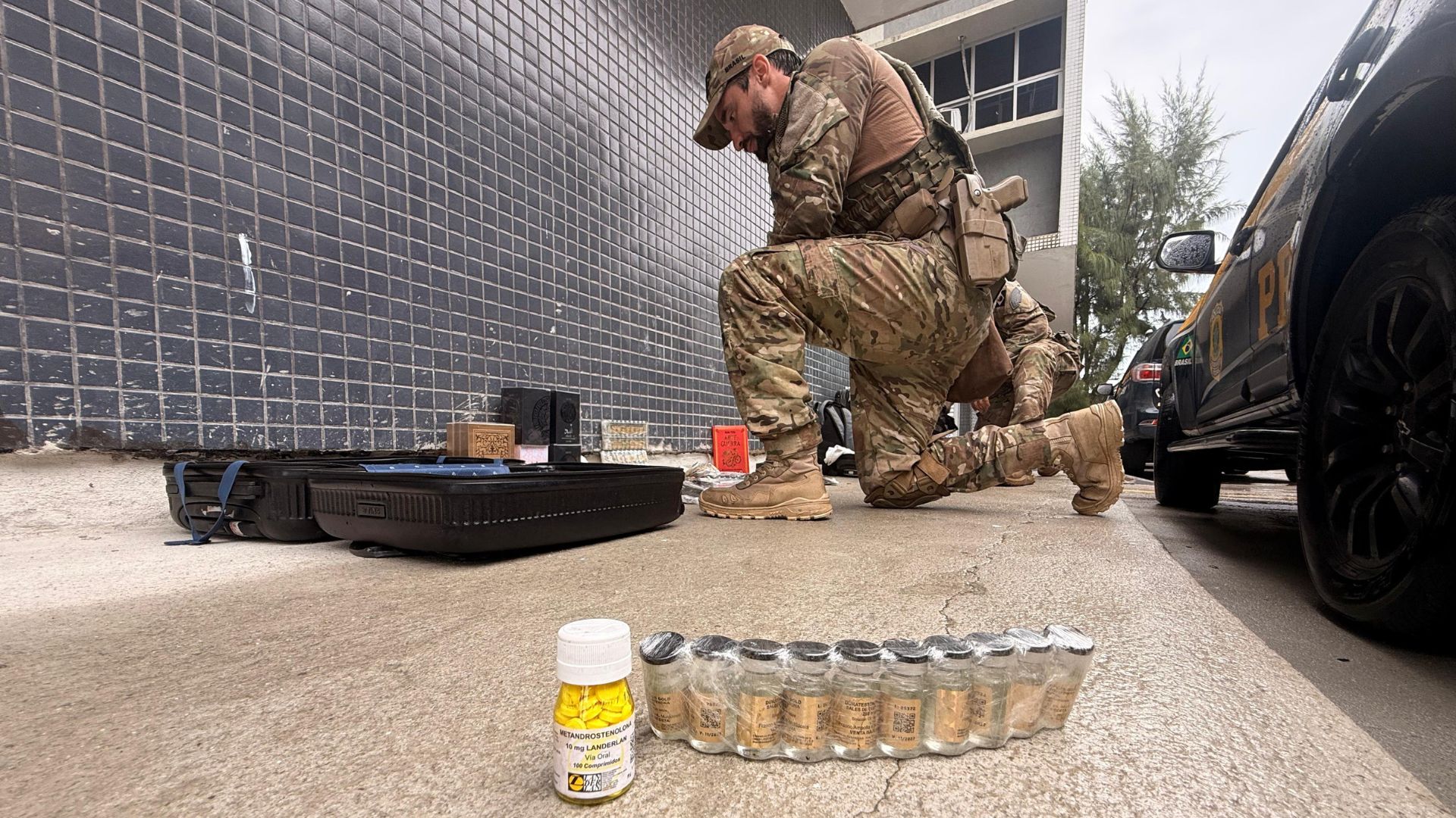 Diante da situação, a equipe aprofundou a fiscalização e realizou uma busca minuciosa no automóvel. Durante a vistoria, foram encontrados compartimentos ocultos no próprio veículo, preparados para esconder mercadorias. Nesses espaços estavam armazenadas centenas de unidades de anabolizantes, incluindo esteroides bastante conhecidos, como Durateston e Deca, além de dezenas de frascos e cartelas de outras substâncias hormonais. Também foram encontrados medicamentos comercializados como emagrecedores, inclusive canetas injetáveis utilizadas para perda de peso.