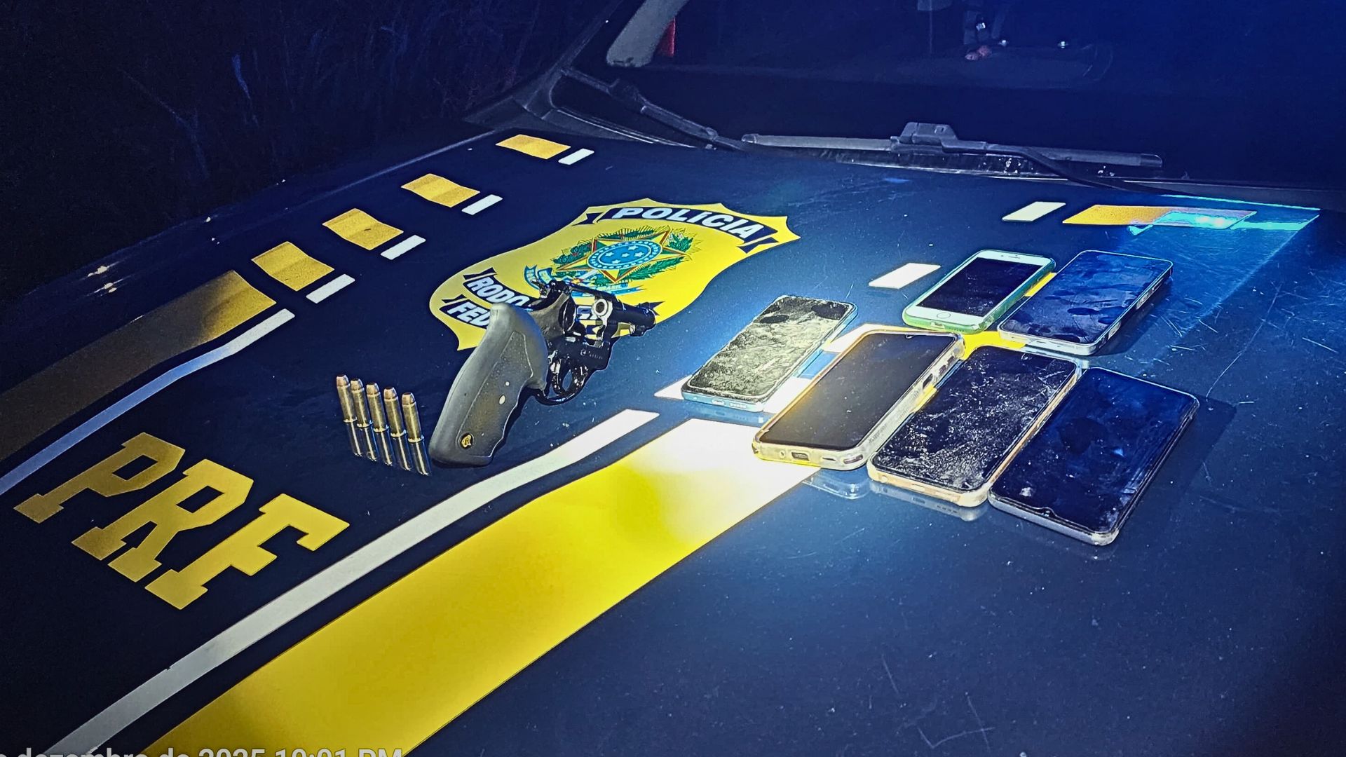 Com base no relato, os policiais iniciaram buscas imediatas pela BR-116. Poucos minutos depois, a equipe conseguiu localizar a motocicleta e realizar a abordagem dos suspeitos já na altura do km 22 da rodovia. Durante a ação, foram encontrados com os dois homens uma arma de fogo municiada e diversos aparelhos celulares, que haviam sido subtraídos das vítimas durante os assaltos.