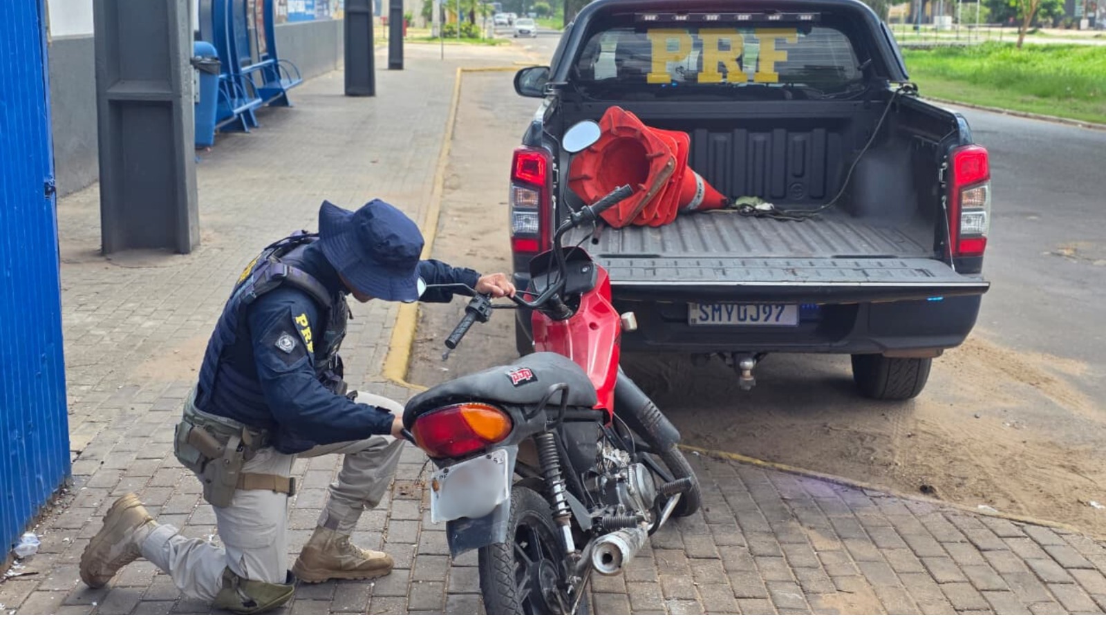 A segunda ocorrência foi registrada no km 252 da BR-010, em Imperatriz (MA), quando uma motocicleta estacionada às margens da rodovia chamou atenção da equipe por apresentar placa em desacordo com o padrão estabelecido pelo CONTRAN. Na inspeção, foram identificados indícios de adulteração na placa, no motor e na numeração do chassi. Após consulta aos sistemas, constatou-se que a motocicleta correspondia a outro registro oficial. O veículo foi apreendido e apresentado na Polícia Civil de Imperatriz (MA). A situação configurou, em tese, o crime de adulteração de sinal identificador de veículo automotor, previsto no artigo 311 do Código Penal.