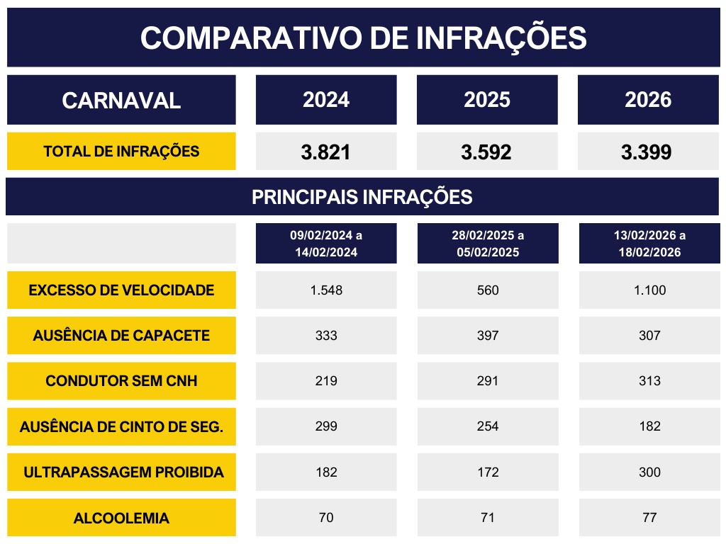 O número de autuações por excesso de velocidade praticamente dobrou, saltando de 560 em 2025 para 1.100 em 2026 — um aumento de 96,4%. Já as ultrapassagens proibidas cresceram 74,4%, passando de 172 para 300 registros.