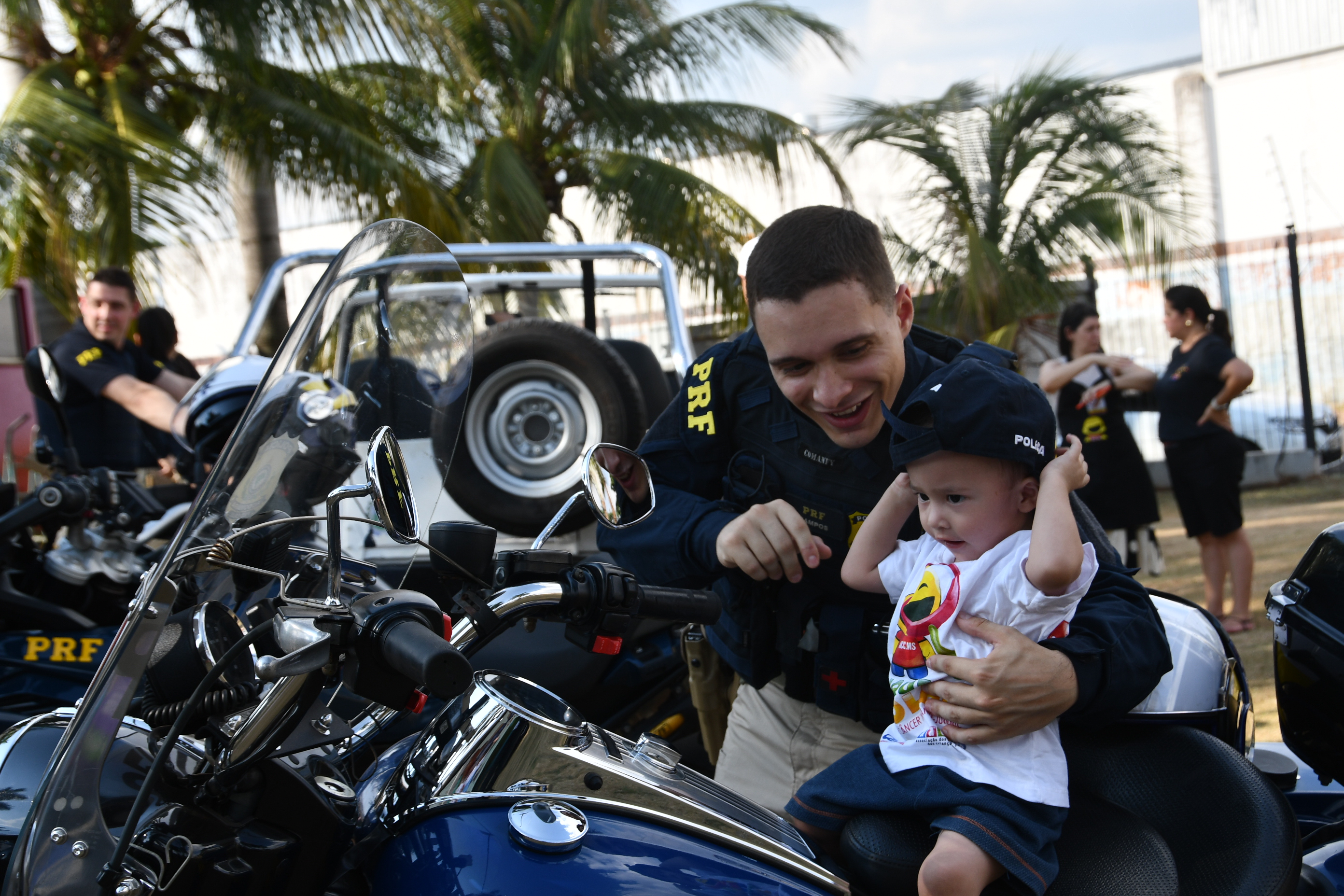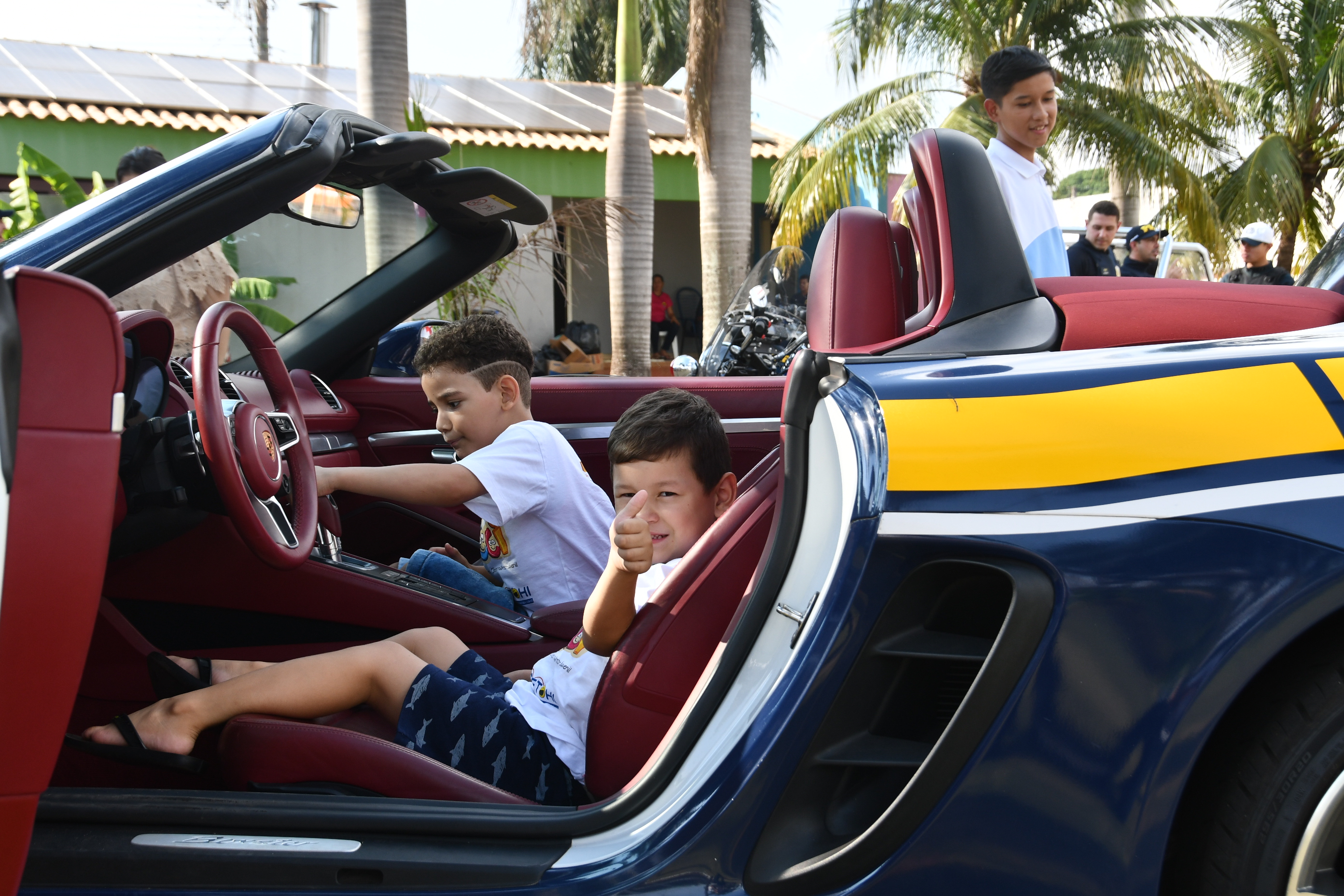 Com a presença de viaturas, incluindo a Porsche apreendida e cedida à PRF, motocicletas e muita alegria, as crianças e familiares puderam entrar nos veículos e registrar muitas fotos.