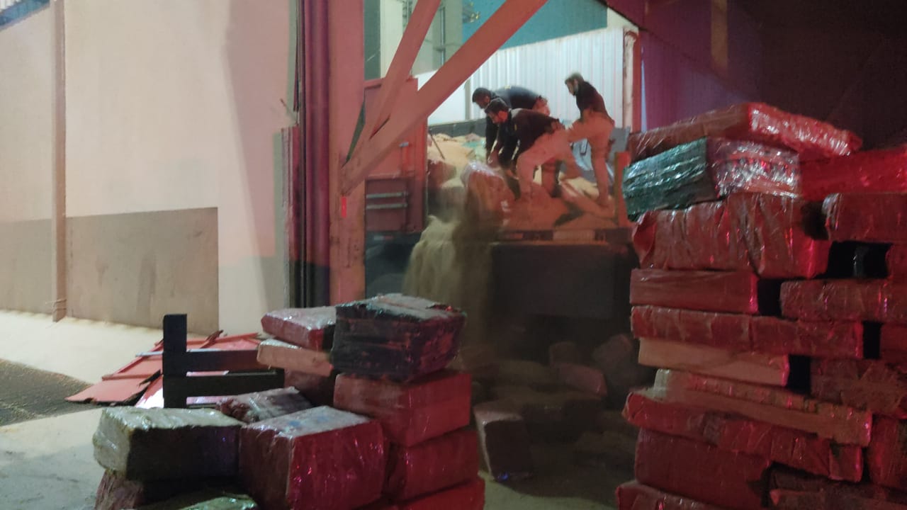Os policiais encontraram diversos fardos de maconha sob a carga de farelo de soja, que totalizaram em 12.400 Kg do ilícito.