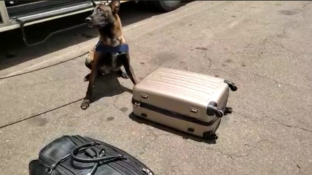 Ao vistoriarem as bagagens dos passageiros, com auxílio dos cães farejadores da PRF, os policiais localizaram 53 tabletes de Maconha prensada dentro de duas malas.
