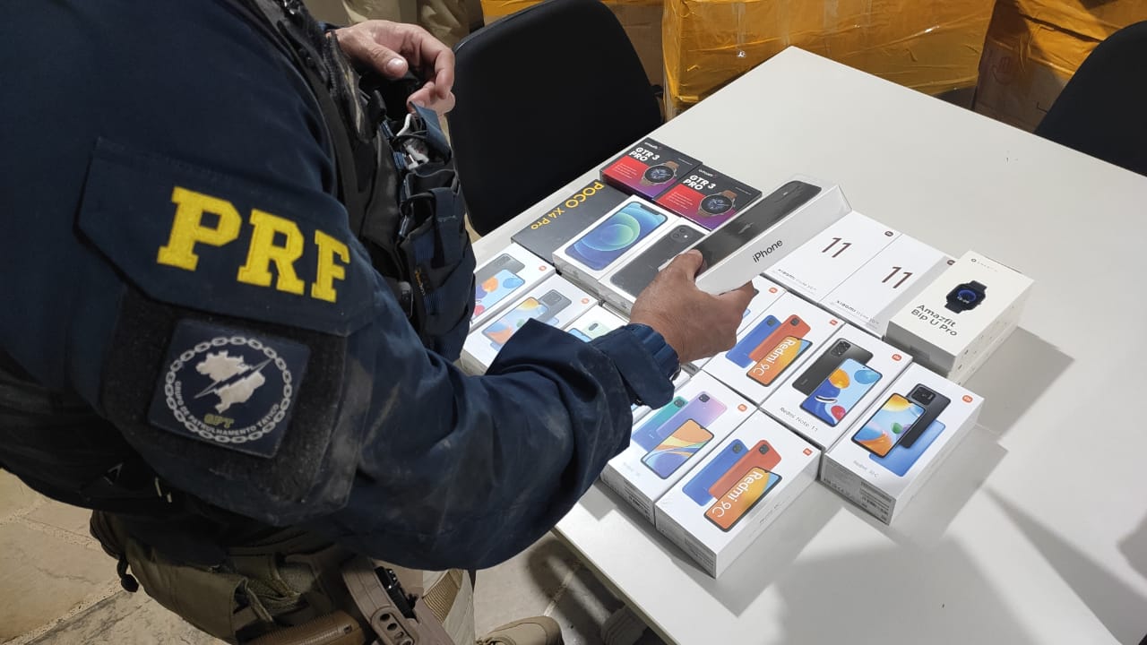 Dentro do bagageiros policiais localizaram diversas caixas onde foram localizados muitos telefones celulares de diversas marcas, vários relógios smartwatch, acessórios para videogames, caixas de som de diversas marcas, fones de ouvido e equipamentos variados de informática.