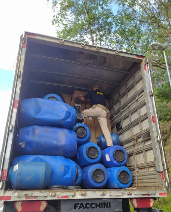No decorrer da fiscalização, o caminhoneiro disse aos policiais que não estava carregado. Foi solicitado então a abertura do compartimento de carga. Neste instante, observou-se a presença de tonéis azuis por toda a extensão do baú do caminhão. O motorista disse ainda que não tinha a nota fiscal da carga.
