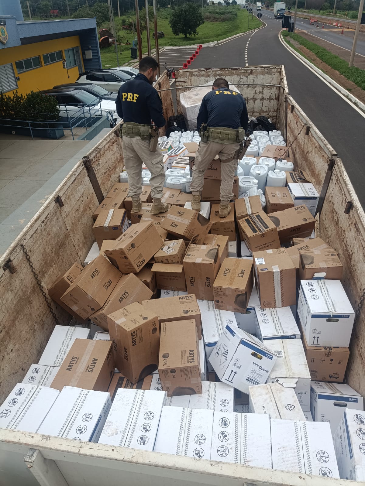 Ao realizar a verificação do veículo, os policiais constataram que as placas estavam adulteradas e eram falsificadas. Além disso, foi confirmado que o caminhão possuía ocorrência de roubo. No interior do veículo, foram encontrados aproximadamente 5.000 litros de defensivos agrícolas, distribuídos em 173 caixas e 95 galões, além de pneus e arame farpado.
