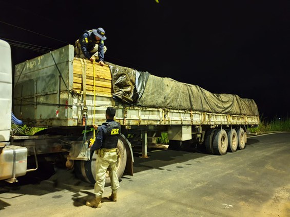 Logo após, a equipe abordou o segundo veículo e o condutor apresentou a documentação fiscal e da carga. Durante análise da Guia Florestal apresentada, os policiais identificaram irregularidade nas informações sobre o veículo responsável pelo transporte da carga.