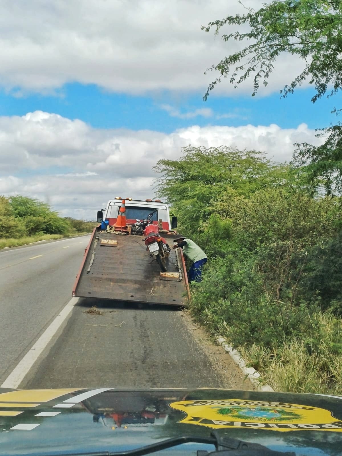 Já nesta terça-feira (23), a equipe se deslocava pela BR-428, em Petrolina, quando avistou dois andarilhos às margens da rodovia, sinalizando parada. Parando no local, ambos informaram que havia uma motocicleta abandonada no matagal, junto ao acostamento. Após consulta, constataram que a moto em questão estaria com restrição de roubo, no N11, também em Petrolina.
