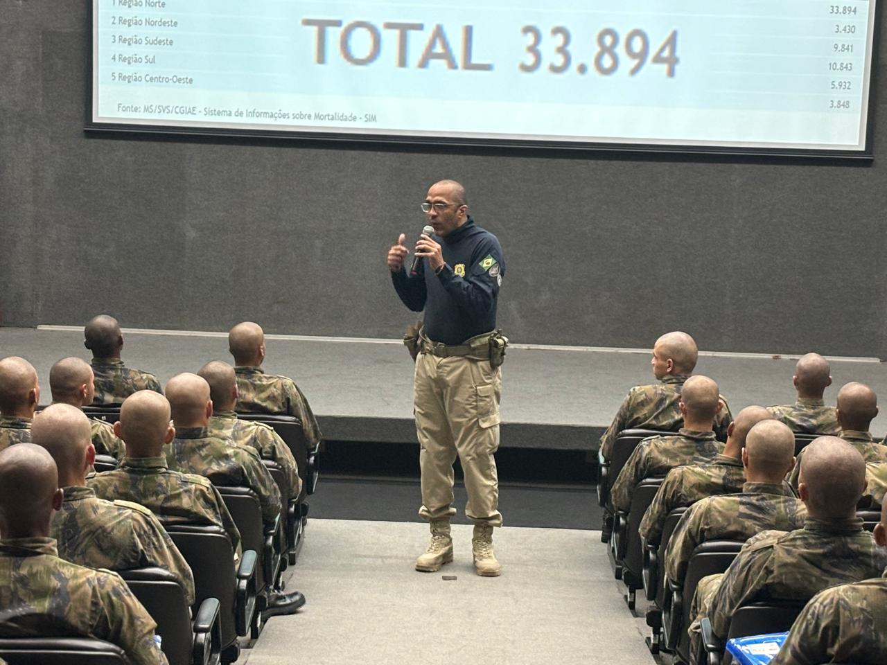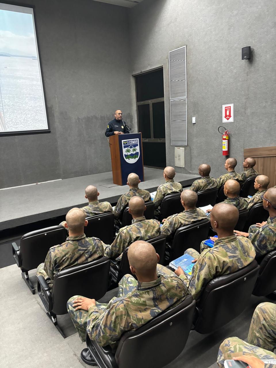 Um total de 140 militares participaram de uma palestra que abordou temas como direção defensiva, condução segura de motocicletas, respeito aos pedestres, uso do celular na direção e o perigo da alcoolemia.