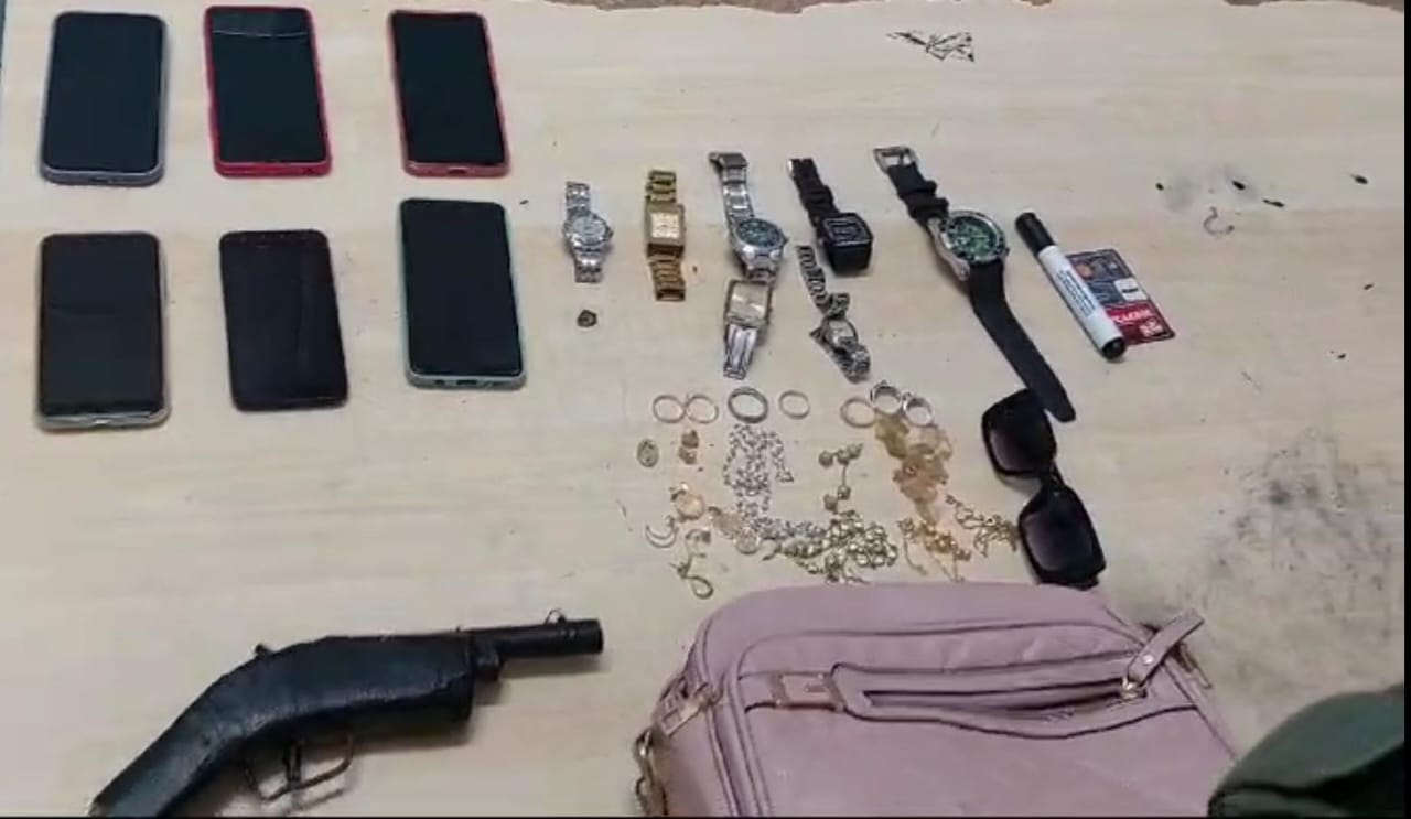 Os policiais recuperaram sete relógios, jóias, uma bolsa, seis aparelhos celulares, um cartão de crédito e um simulacro de arma de fogo.