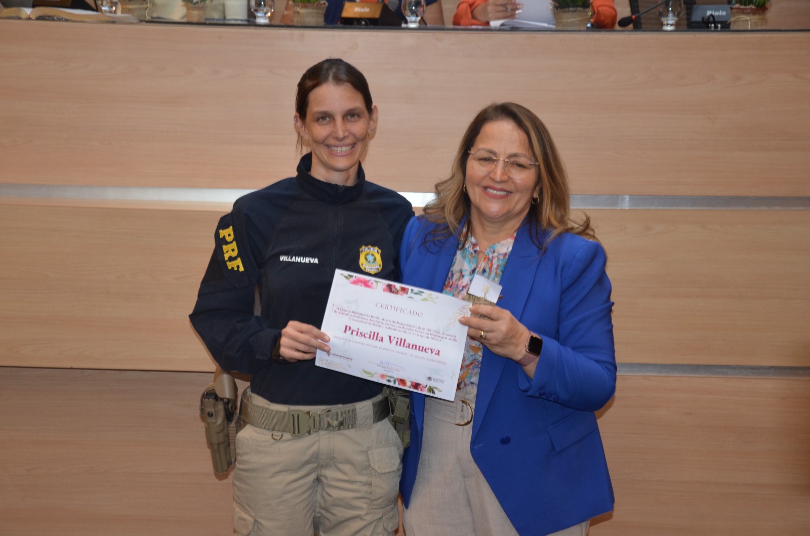 A presidente da Comissão Regional de Direitos Humanos da PRF, Priscila Villanueva, recebeu uma homenagem em alusão ao Dia Internacional da Mulher, nesta quinta-feira (21), na Câmara de Vereadores do Recife. A iniciativa da vereadora Professora Ana Lúcia buscou reconhecer as mulheres que se destacaram em diversos segmentos da sociedade pernambucana.