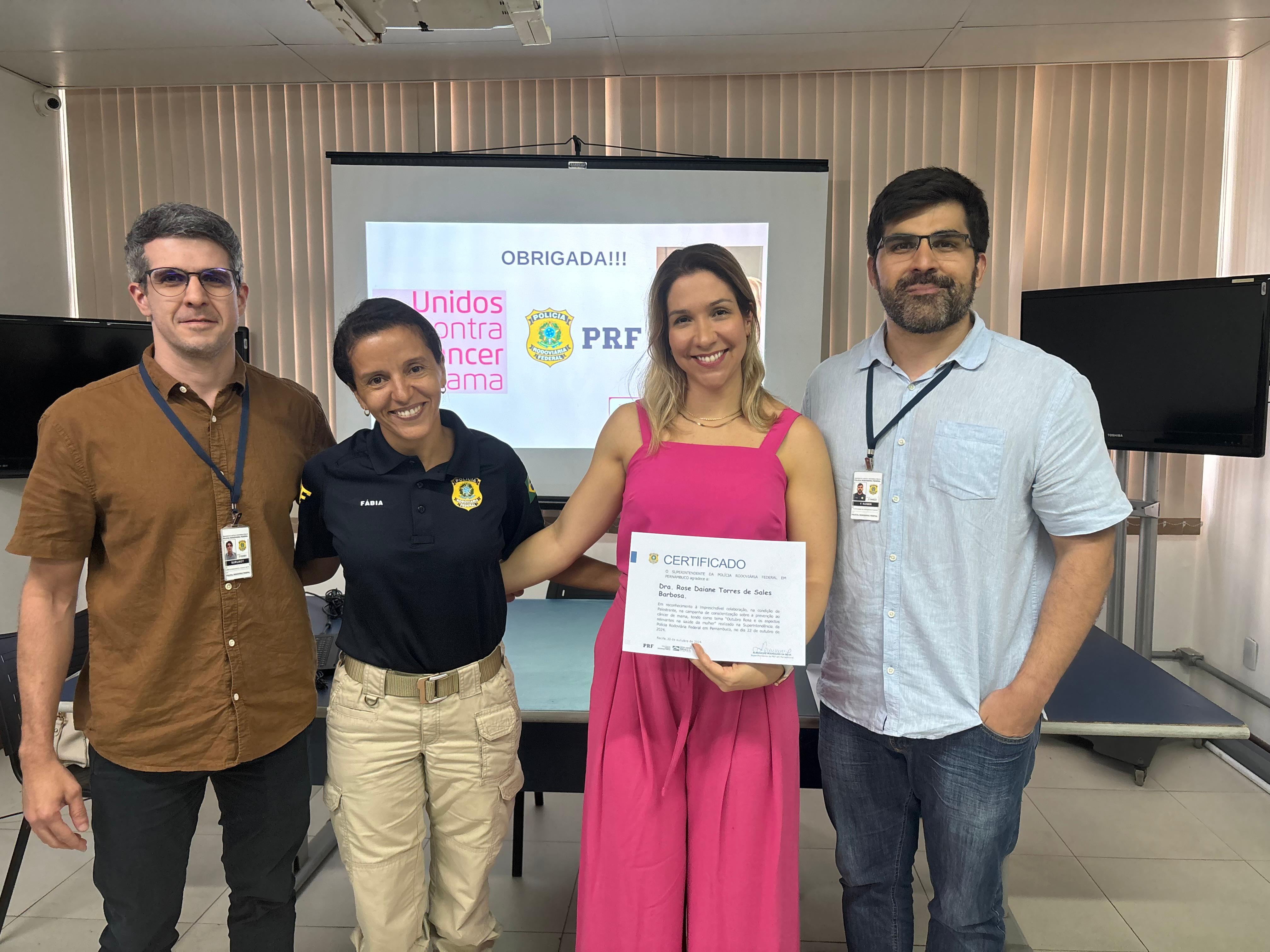 A Polícia Rodoviária Federal em Pernambuco, por meio do Núcleo de Saúde Integral do Servidor (Nusint). promoveu, nesta terça (22), uma palestra sobre o Outubro Rosa e a saúde da mulher. O objetivo foi chamar a atenção para a campanha de conscientização que tem como objetivo principal alertar as mulheres e a sociedade sobre a importância da prevenção e do diagnóstico precoce do câncer de mama.