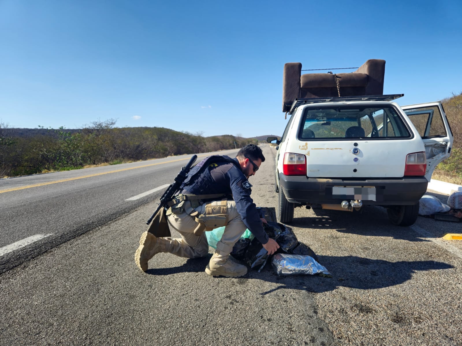 Policiais realizavam uma fiscalização na rodovia, quando avistaram um sofá sendo transportado de forma irregular no teto de um Uno. Durante a abordagem, a equipe percebeu que os ocupantes entraram em contradição e realizou uma busca no veículo, até encontrar 8 pacotes da droga.