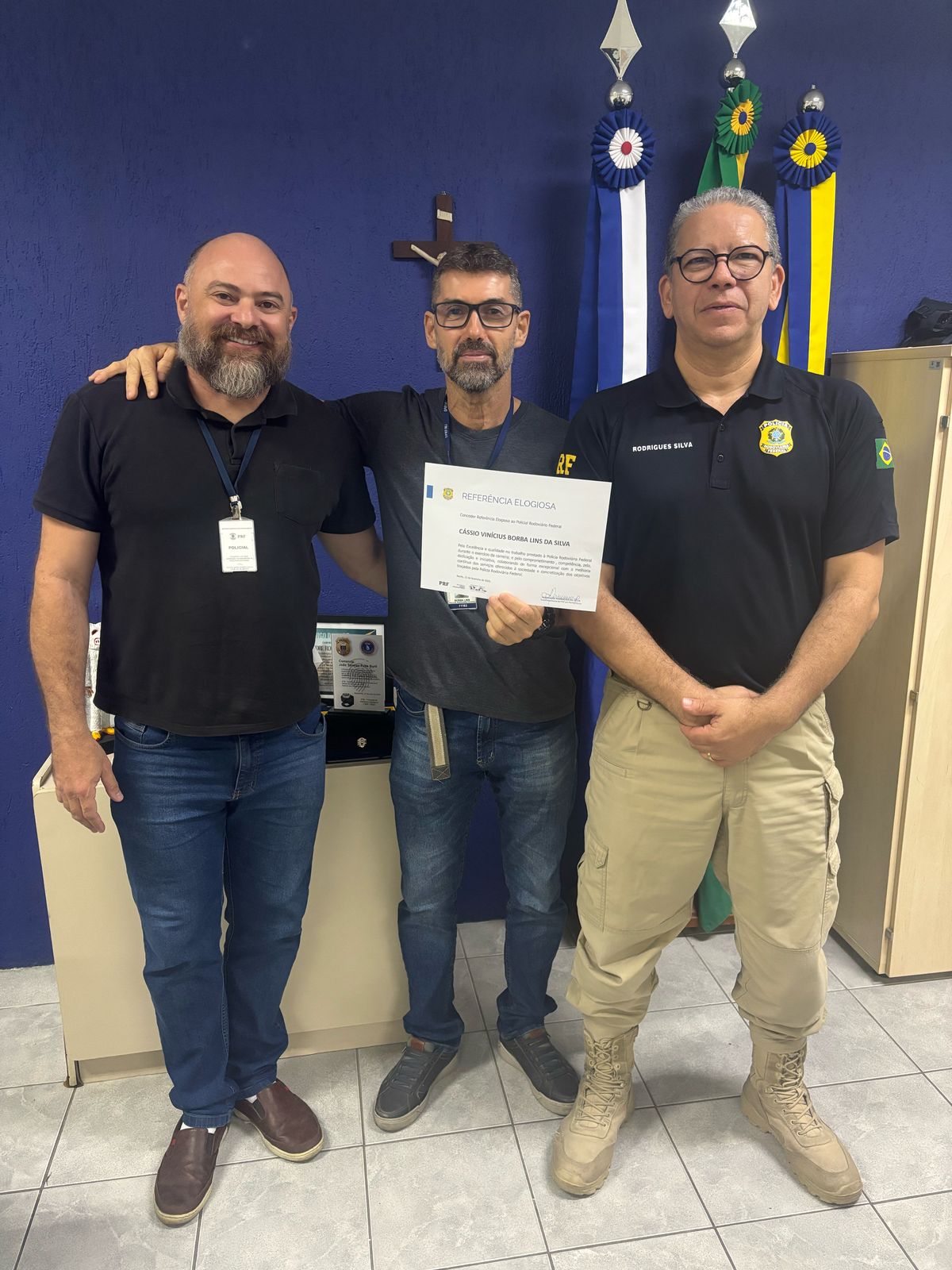 A Polícia Rodoviária Federal (PRF) promoveu nesta quarta-feira (19), uma entrega de certificados de referência elogiosa aos aposentados Laurenio Albuquerque da Silveira Filho e Cássio Vinícius Borba de Lins da Silva. O primeiro se aposentou em setembro de 2024 e o segundo, em fevereiro deste ano. Ambos tiveram o trabalho reconhecido durante a carreira na instituição.