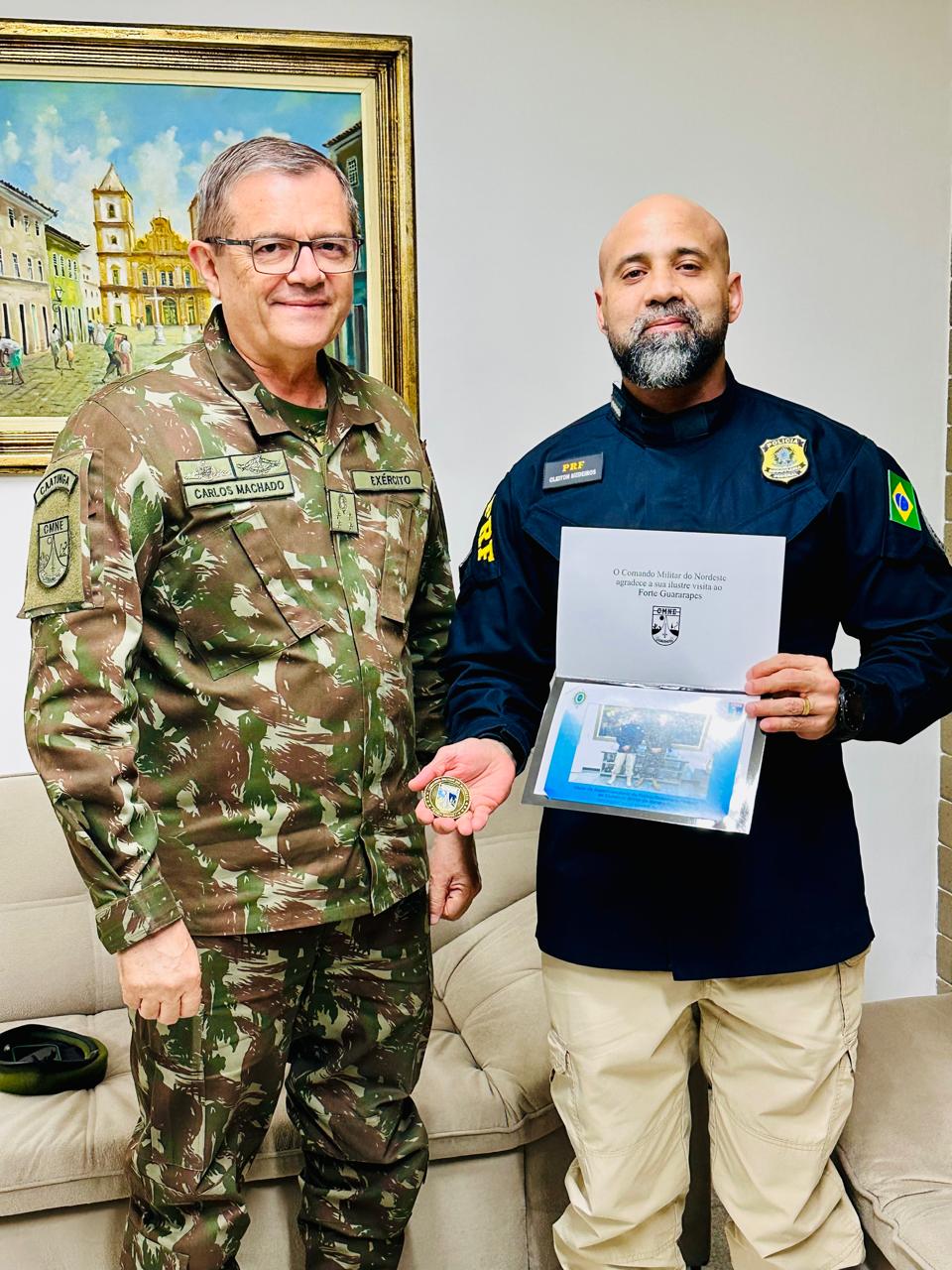 Na oportunidade, o Superintendente da PRF realizou a entrega da moeda institucional da Polícia Rodoviária Federal ao General Carlos Machado, como forma de reconhecimento e valorização da parceria institucional. Em gesto de reciprocidade, o Comandante do CMNE presenteou o superintendente com a moeda institucional do Comando Militar do Nordeste.