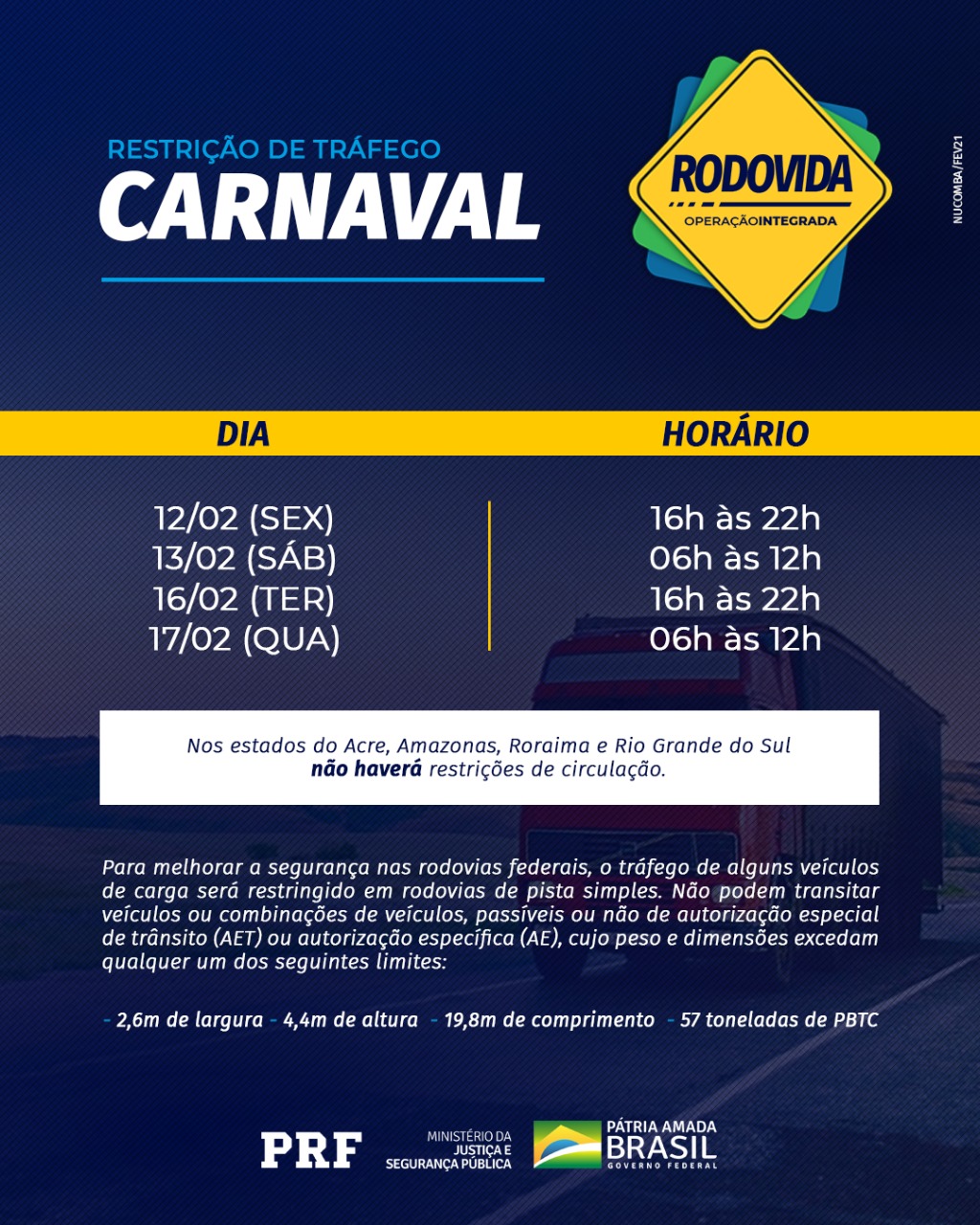 Veículos de carga com dimensões ou pesos excedentes estarão impedidos de transitar em trechos de pista simples das 16h00 às 22h00 de sexta-feira(12), na manhã de sábado(13), das 06h00 às 12h00, das 16h00 às 22h00 de terça-feira(16) e na manhã de quarta-feira(17), das 06h00 às 12h00.