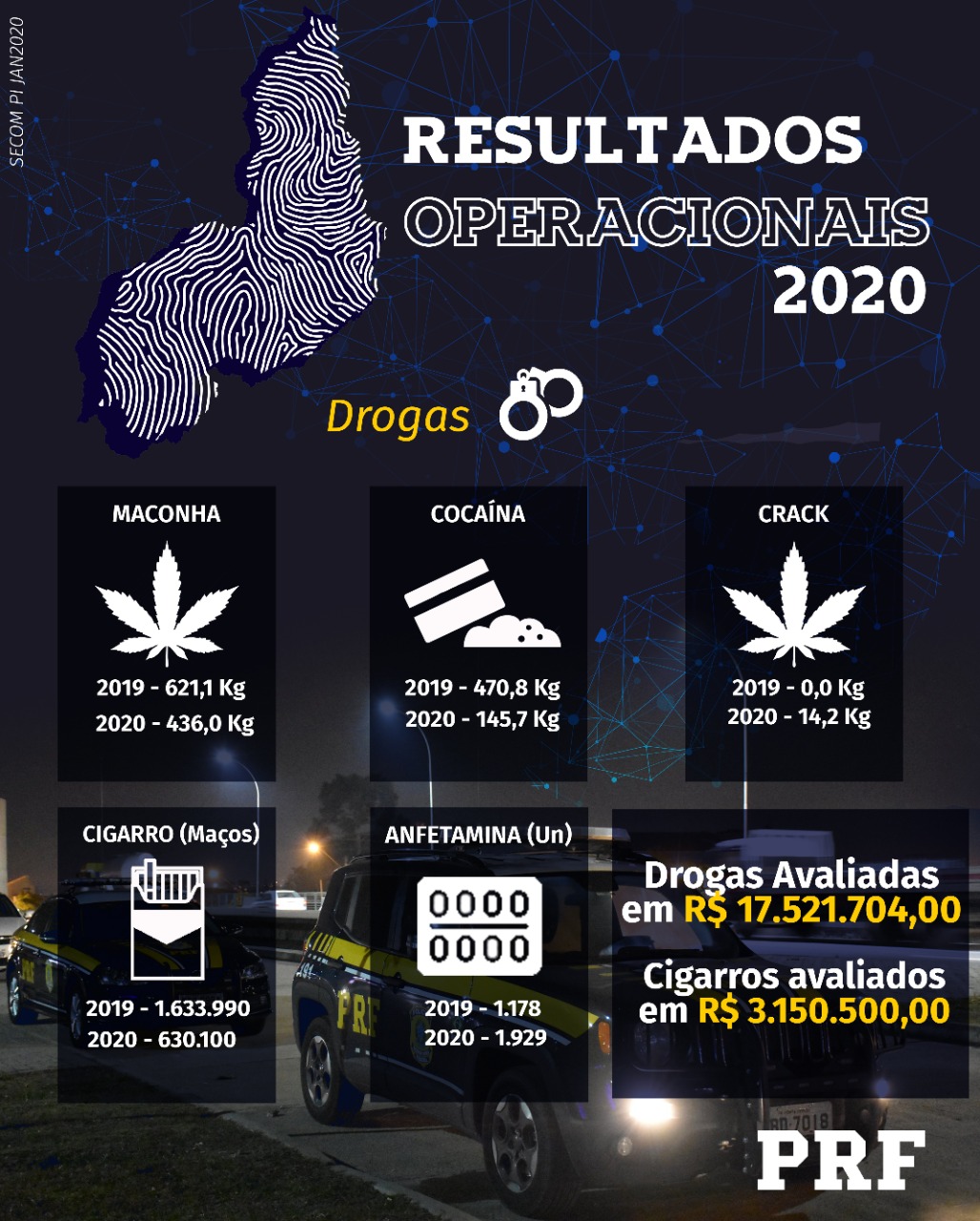 A Polícia Rodoviária Federal divulgou na manhã de hoje(03) os números referentes ao cenário de combate à criminalidade durante o ano de 2020. Ao todo, foram 1.498 pessoas presas pelo cometimento de diversos crimes. Com relação ao combate ao tráfico de drogas, Foram 43 pessoas presas por esse crime resultando na apreensão de 436,0kg de maconha, 145,7kg de cocaína e 14,2kg de crack. O diferencial esse ano foi a qualidade da droga apreendida, principalmente por se tratar, na sua maioria, de cloridrato de cocaína, pasta base e skunk que são drogas de alto teor de pureza. Por ter um alto valor, a PRF deu um prejuízo aos traficantes na ordem de R$ 17.521.704,00.