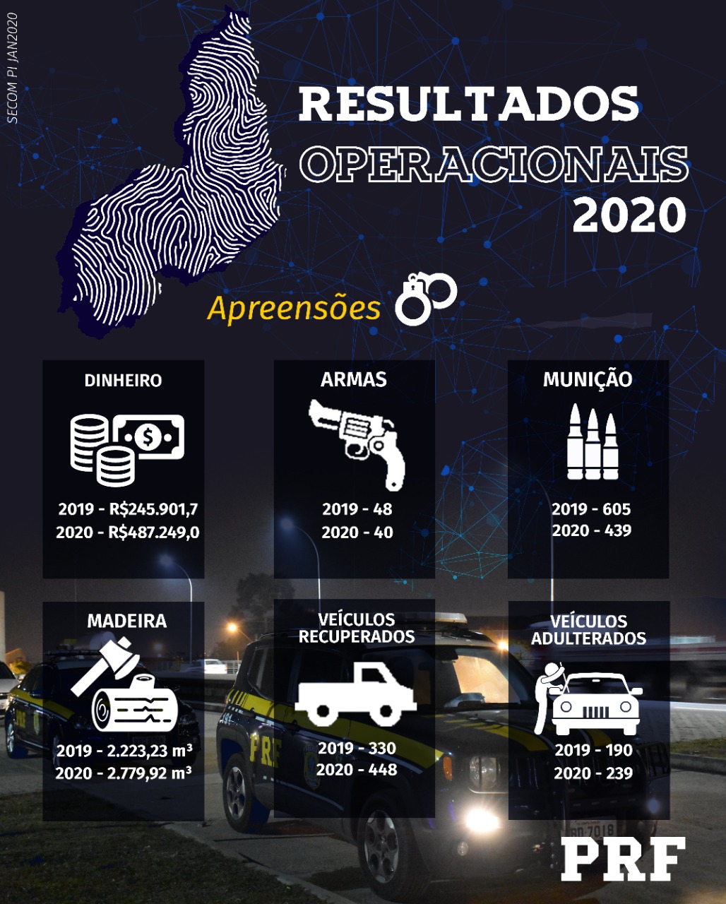 Sobre o trabalho de combate às fraudes veiculares, a PRF esteve no cenário nacional como um dos estados que mais recuperam veículos roubados ou adulterados. Foram 448 veículos recuperados, superando em 35,8% a quantidade realizada em 2019 e apreendeu 239 veículos que estavam adulterados, superando em 25,8% a quantidade de veículos no ano anterior.