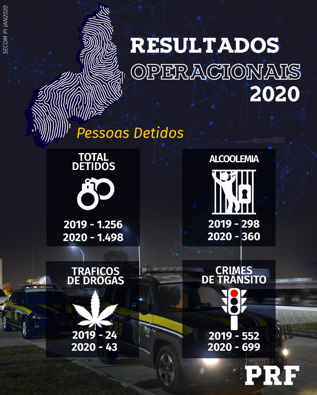 A instituição registrou também 699 pessoas que foram presas cometendo Crimes de Trânsito. Isso representa um aumento de 26,6% se comparado ao ano de 2019, indicando o trabalho da PRF em dar segurança às pessoas que transitam por nossas rodovias federais.