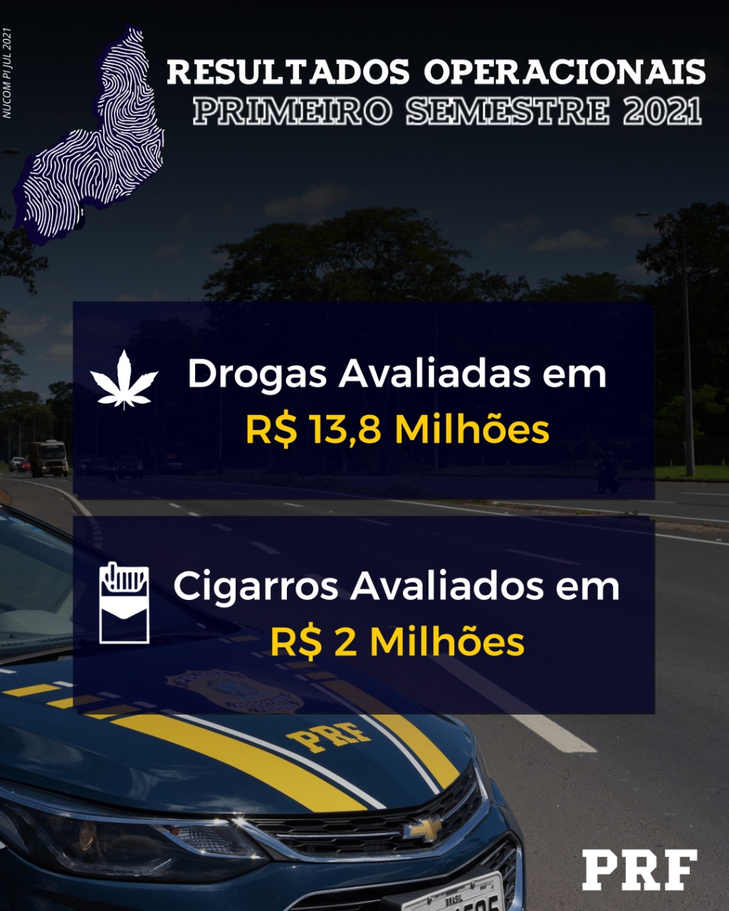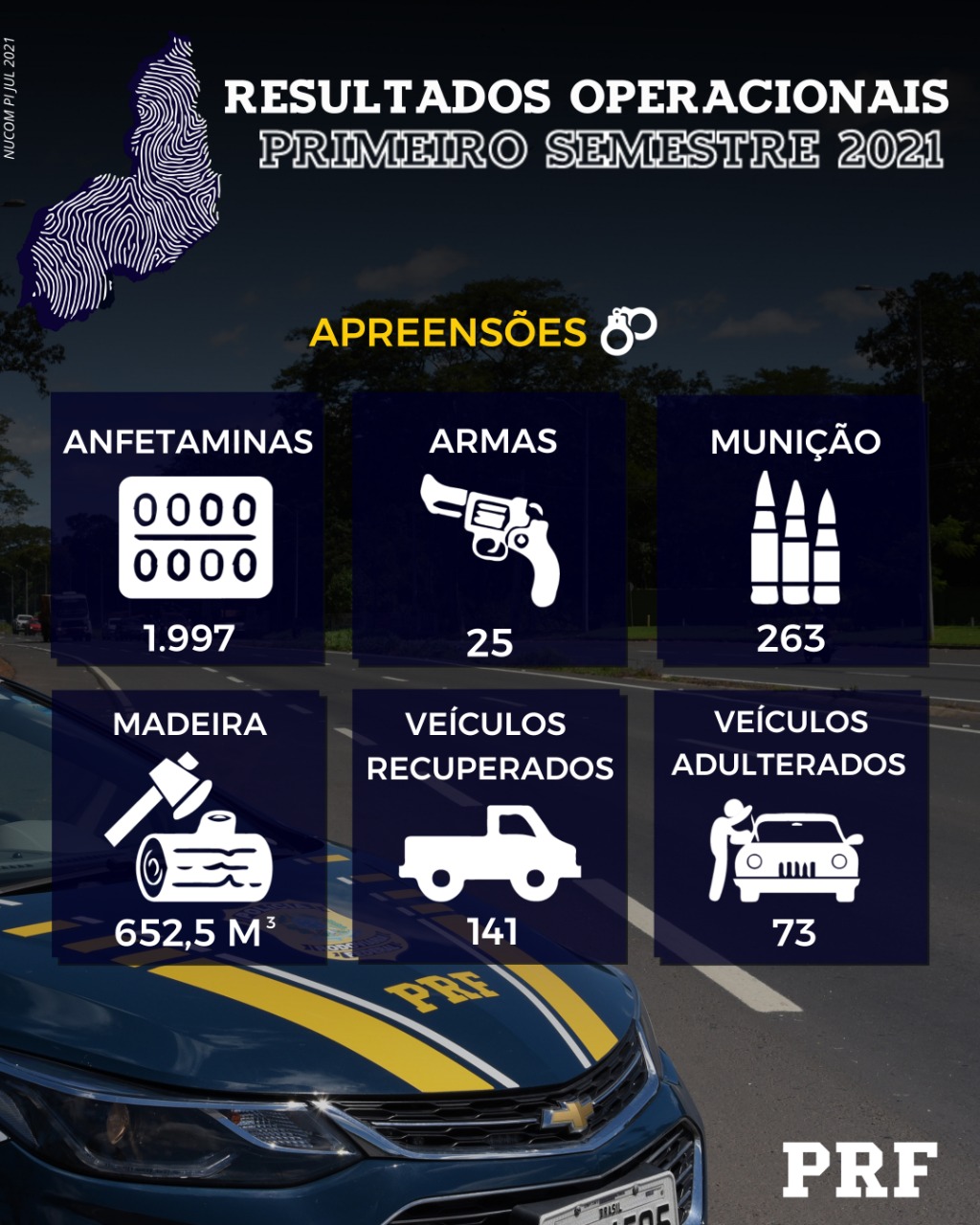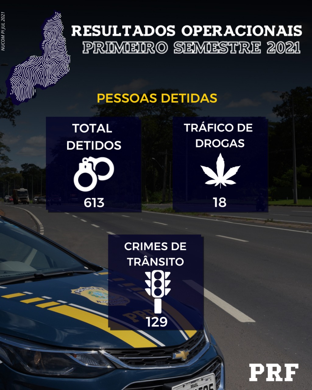 A Polícia Rodoviária Federal divulgou na noite de hoje(19) os números referentes ao cenário de combate à criminalidade durante o primeiro semestre de 2021. Ao todo, foram 613 pessoas presas pelo cometimento de diversos crimes. Com relação ao combate ao tráfico de drogas, Foram 18 pessoas presas por esse tipo de crime, resultando na apreensão de 725,4 kg de maconha, 58,5 kg de Cloridrato de Cocaína, 26,8 kg de Pasta Base de Cocaína, 15,4 kg de Cocaína e 41,6 kg de crack. A quantidade de droga apreendida nos primeiros seis meses do ano supera em 45,4 % toda a quantidade apreendida em 2020. O diferencial esse ano foi a qualidade da droga apreendida, principalmente por se tratar, na sua maioria, de cloridrato de cocaína e pasta base que são drogas de alto teor de pureza. Por ter um alto valor, a PRF deu um prejuízo aos traficantes na ordem de R$ 13,8 Milhões.