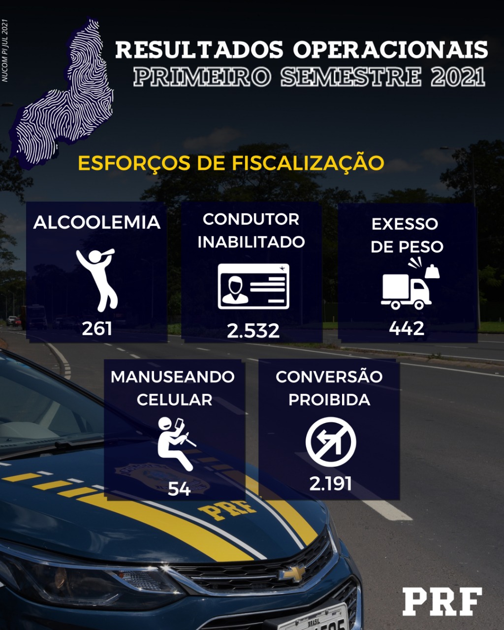 A PRF lavrou 7.220 autos de infração em condutores de motocicletas por não uso do capacete de segurança se tornando o estado que mais autua por este motivo, 3.020 por Ultrapassagem em local proibido, 942 por Conduzir veículo ou transportar o passageiro sem o cinto de segurança, 2.532 por Conduzir sem possuir CNH, 2.191 por Executar Conversão Proibida à esquerda, 1.888 pelo veículo estar Indevidamente Licenciado e 54 por Dirigir usando telefone celular. Com relação à fiscalização de alcoolemia, foram realizados 1.397 Testes de alcoolemia e lavrados 261 autos de infração, resultando em 113 pessoas presas por este motivo. As principais infrações de trânsito flagradas pelos policiais ainda são as que tem maior gravidade e podem resultar em acidentes graves. Apesar da redução dos números de testes de alcoolemia, a quantidade relativa de pessoas presas por dirigir sob o efeito de álcool nos primeiros seis meses de 2021 superou em 87,1 % a quantidade em 2020.