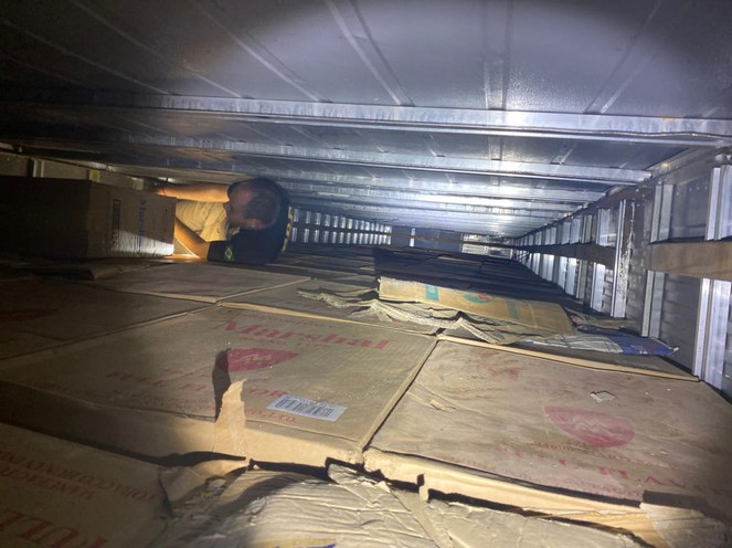 Durante vistoria no compartimento de carga do caminhão foram encontrados 450.000 maços de cigarros da marca Marshal que estavam escondidos por trás de um carregamento de papelão, na tentativa de ludibriar a fiscalização. A equipe recebeu o suporte de um comércio local que cedeu empilhadeiras para retirar a carga de papelão que escondia o ilícito.