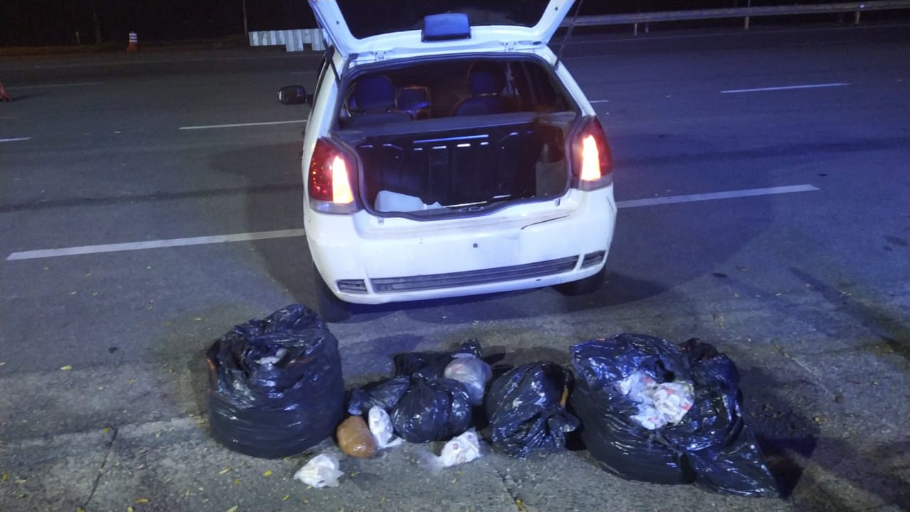 Quando abriram o porta-malas, os policiais encontraram sacos plásticos e sentiram forte odor de entorpecentes. Havia aproximadamente 8 mil pinos de cocaína, 600 trouxinhas de maconha e um tablete de cocaína. Foram contabilizados 17,1 quilos de cocaína e 1,8 quilo de maconha.