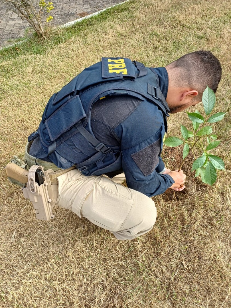 Os policiais encerraram o evento com o plantio de uma das mudas na área de jardim da Unidade Operacional PRF. O plantio de árvores nativas é fundamental para auxiliar na preservação da biodiversidade.