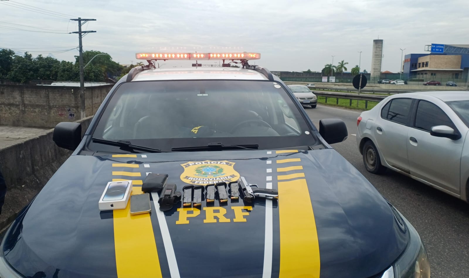 Por volta das 11h, na altura de Duque de Caxias, policiais rodoviários federais abordaram um veículo suspeito. Durante a fiscalização, encontraram uma bolsa abaixo do banco do passageiro, onde havia uma pistola - calibre 9mm - e cinco carregadores, contendo 70 munições.
