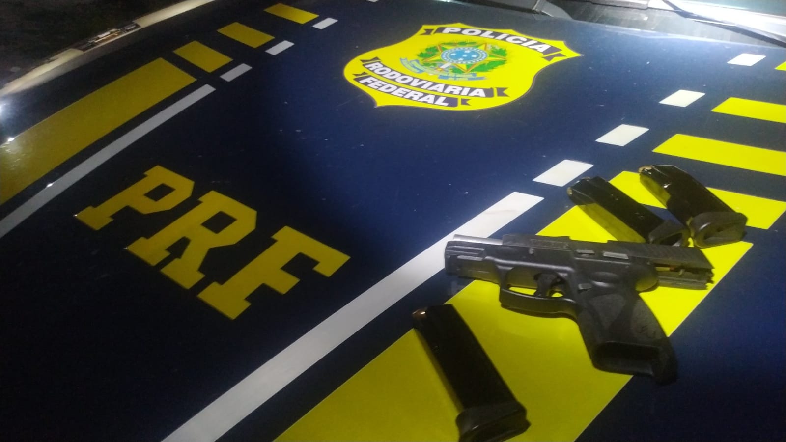 A Polícia Rodoviária Federal recuperou um veículo, apreendeu uma arma de fogo com 35 munições e prendeu dois homens nesta segunda-feira (13/03).