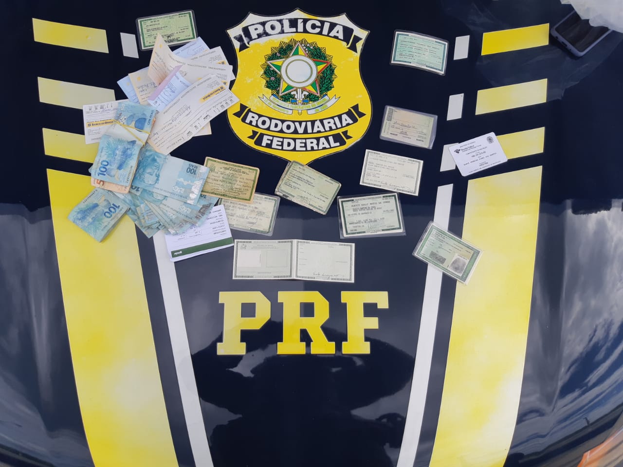 Durante fiscalização de rotina foi abordado um Fiesta de cor branca, com placas do Mato Grosso (MT). Os policiais desconfiaram do nervosismo apresentado pela dupla e solicitaram a documentação pessoal e do veículo. Os homens então apresentaram CNHs e RGs com indícios de adulteração, fato que levou a uma busca minuciosa no interior veículo. Dentro do veículo foram encontrados diversos RGs de terceiros, além de cheques (em branco e preenchidos), quatro celulares, um tablet e a quantia de R$ 4.718,00 em dinheiro vivo.