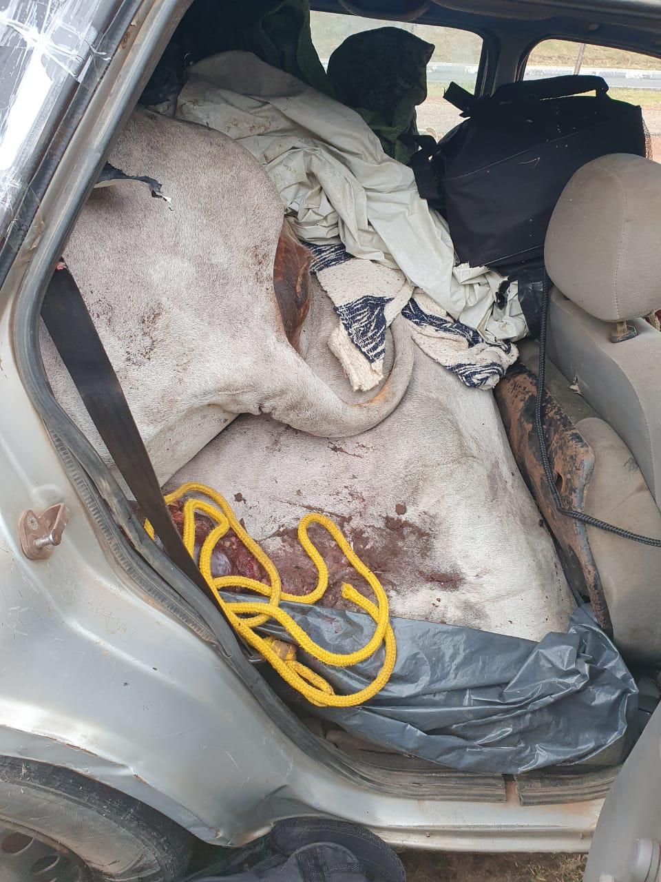 Na inspeção veicular, os PRF’s encontraram três armas, seis munições, 200 quilos de carne bovina e materiais pessoais.