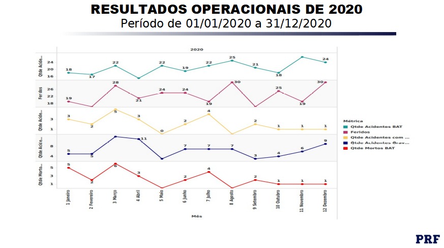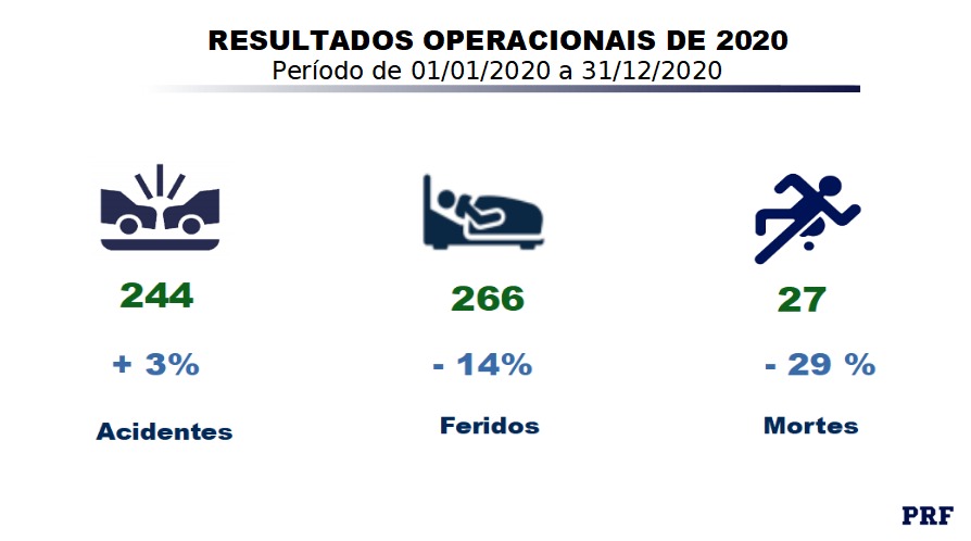Apesar de todos os esforços da PRF em aumentar o policiamento ostensivo preventivo, 244 acidentes aconteceram em 2020, praticamente o mesmo se comparado ao ano anterior. Por outro lado, houve uma redução de 29% das mortes nas rodovias do estado.