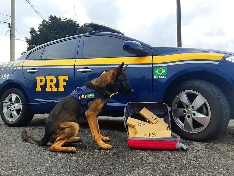 Cão farejador da PRF encontra mala com maconha em ônibus na Dutra