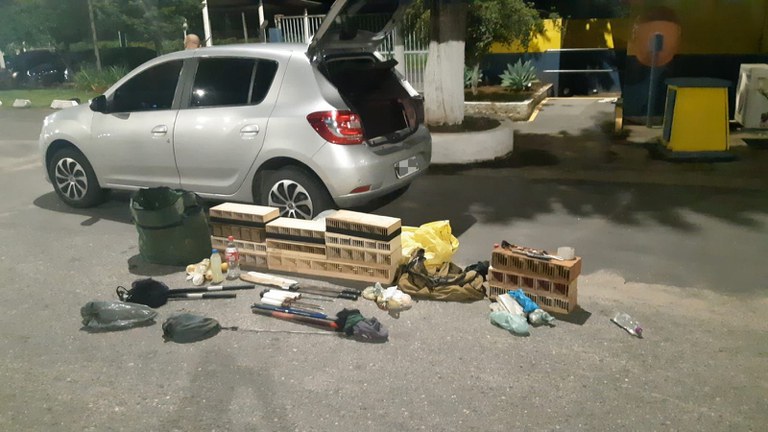 O veículo era ocupado por quatro indivíduos, e em seu interior foram localizadas 2 gaiolas contendo um pássaro da espécie "trinca ferro" cada, além de diversos equipamentos utilizados para caça de aves, tais como: varas telescópicas com redes de neblina, estacas para afixação das caras, facões, estilingue e uma grande quantidade de gaiolas que seriam utilizadas para captura de outros pássaros na mata.