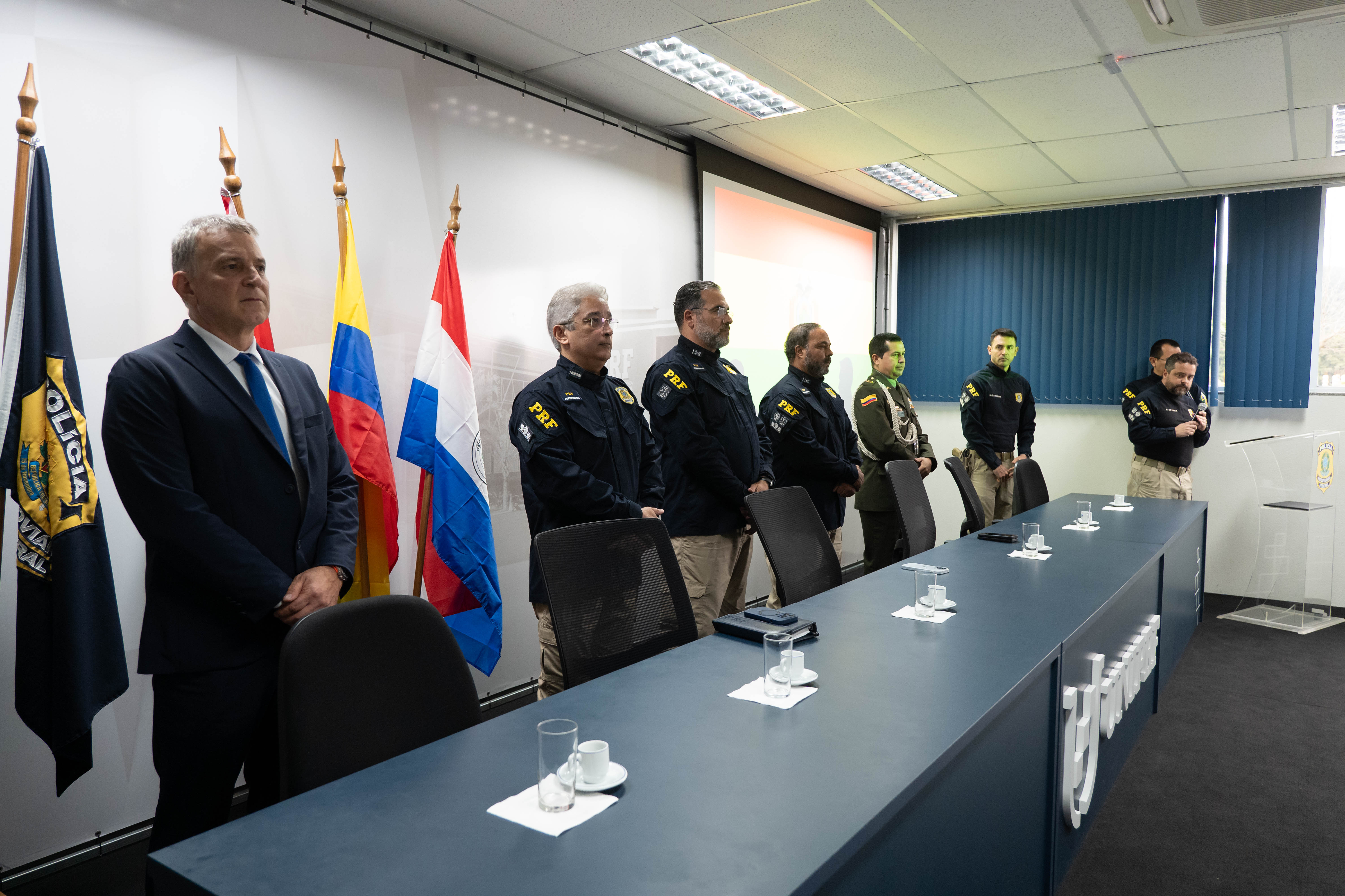 Compuseram a mesa de honra o Diretor-Geral da PRF, Antonio Fernando Souza Oliveira; o Diretor de Operações, Marcus Vinicius Silva de Almeida; o Diretor da UniPRF, Jefersson Antonio de Oliveira; o Adido Policial da Colômbia no Brasil, Coronel Jose Abdon Galindo Sanches; o Coordenador-Geral do Curso Internacional de Segurança Viária, PRF Márcio Geraldo Lara Camargos Junior; e o Oficial Técnico em Segurança Viária e Prevenção de Lesões Não Intencionais da Organização Pan-Americana da Saúde (OPAS/OMS) no Brasil, Sr. Roberto Victor Pavarino Filho.