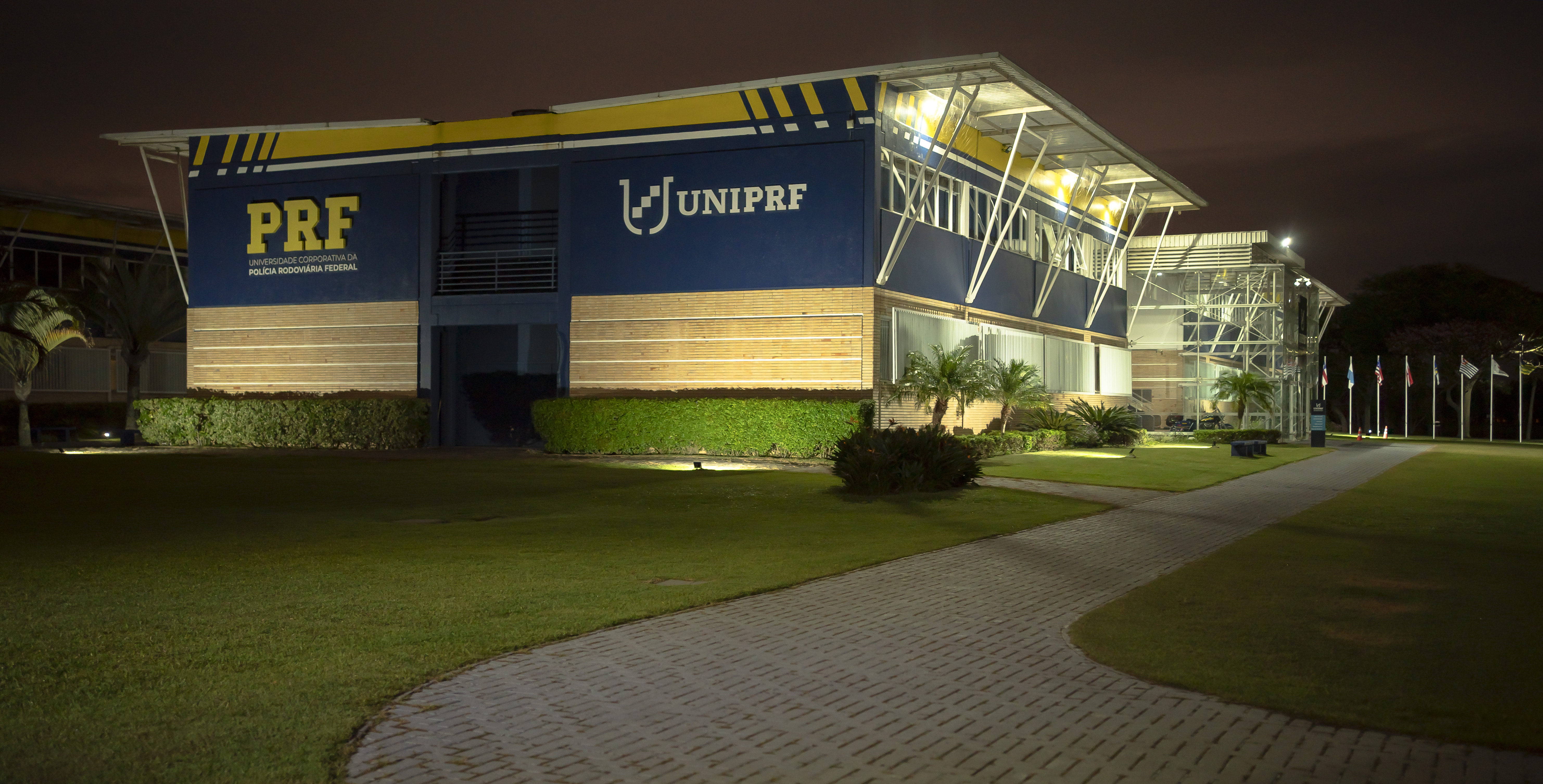 A fachada da Universidade Corporativa da PRF exibida sob luzes, durante à noite.