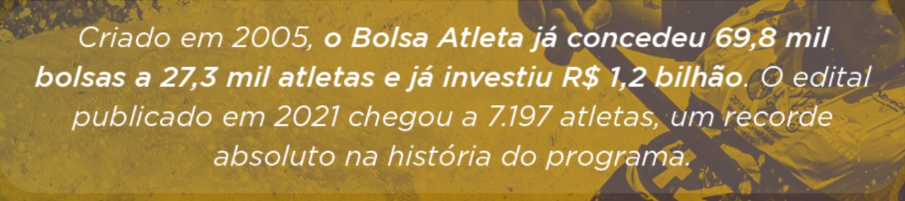 Segundo o Ministério da Cidadania, o Governo Federal é o maior patrocinador do esporte olímpico e paralímpico no país, com um investimento anual superior a R$ 750 milhões. Além do Bolsa Atleta, entram também a Lei das Loterias e a Lei de Incentivo ao Esporte.