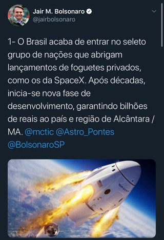 Em suas redes sociais, o presidente da República, Jair Bolsonaro, comentou sobre essa nova etapa na política espacial. “ O Brasil acaba de entrar no seleto grupo de nações que abrigam lançamentos de foguetes privados, como os da SpaceX. Após décadas, inicia-se nova fase de desenvolvimento, garantindo bilhões de reais ao país e região de Alcântara /MA”.