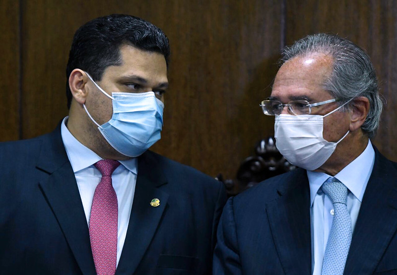O ministro da Economia, Paulo Guedes entrega o texto da Reforma Tributária ao presidente do Senado Federal, Davi Alcolumbre.