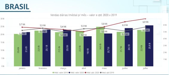 Na região Centro-Oeste, a média diária de vendas em julho de 2020 foi superior à de 2019 em 24,7%. Na comparação com o mês anterior, as vendas no mês de julho apresentaram uma redução de 2,3%.