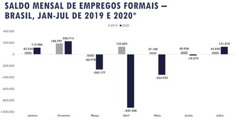 Além do número de admissões ter aumentado 14%, os desligamentos caíram no período. Em junho 935.646 pessoas perderam o emprego e em julho foram registrados 912.640 desligamentos.